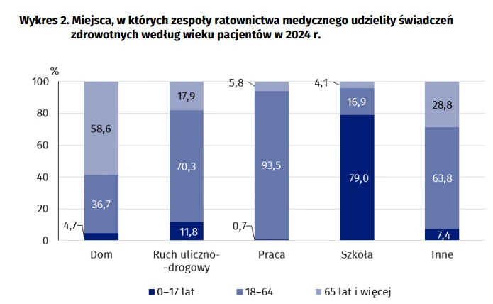 Dzieci stanowiły 19,1% ogólnej liczby pacjentów w SOR-ach i izbach przyjęć, a osoby w wieku 65+ – 27,6% (wzrost z 26,8% w 2023 r.).