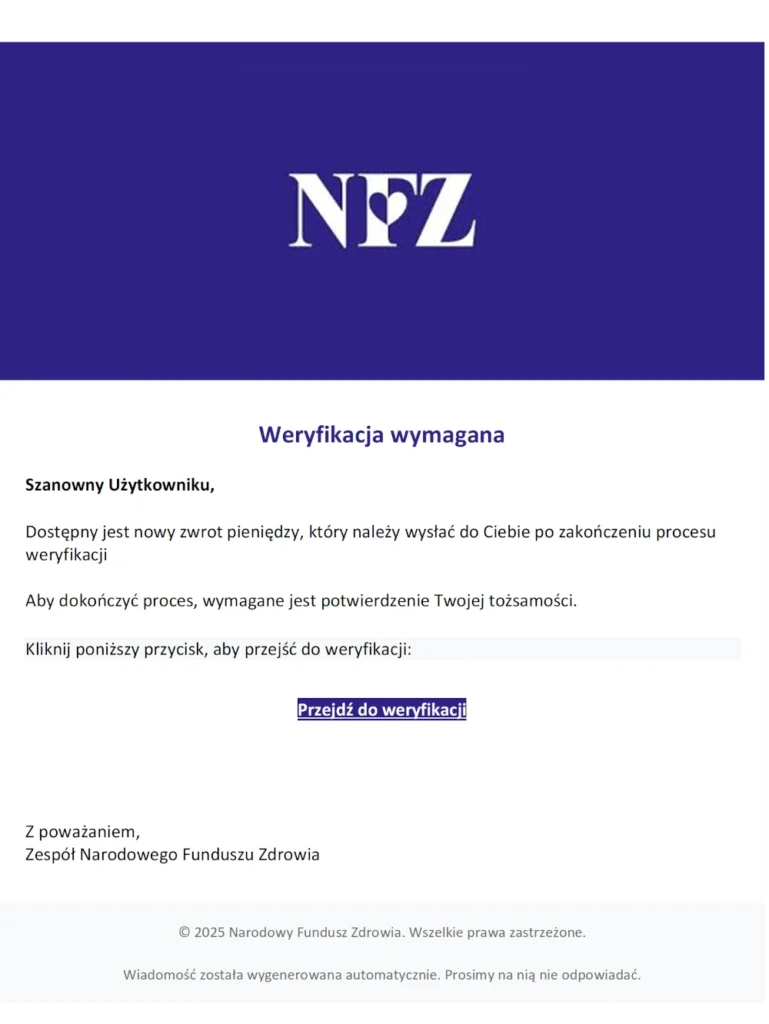 Podszywanie się pod NFZ w wiadomościach e-mailowych lub SMS-owych to nie nowość, jednak schemat oszustwa jest coraz bardziej zaawansowany. W wiadomości znajduje się logo Funduszu, poprawna polszczyzna, a całość sprawia wrażenie oficjalnego komunikatu. Treść sugeruje, że „dostępny jest nowy zwrot pieniędzy” i że wystarczy kliknąć w przycisk, by zakończyć weryfikację.